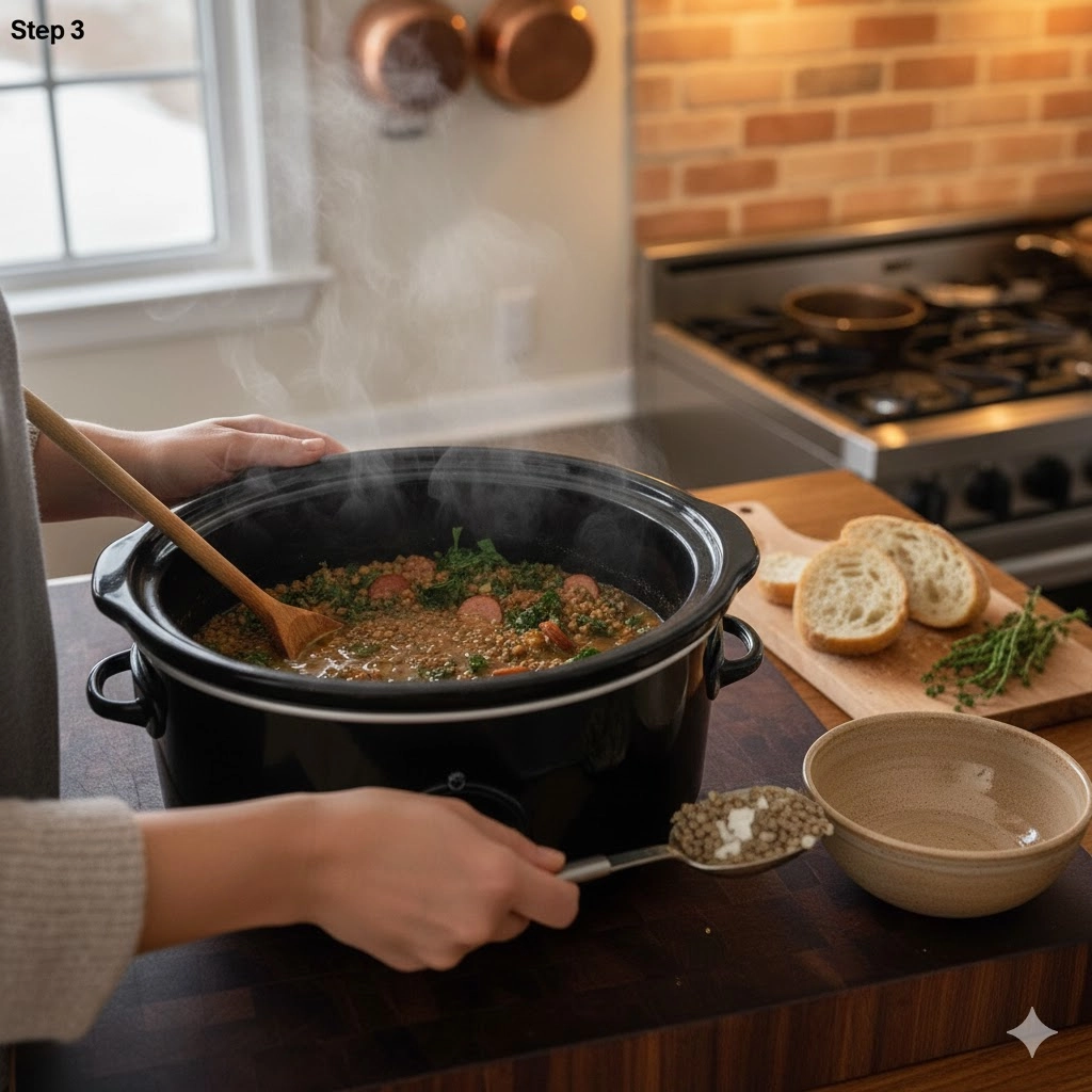 As the chicken sausage simmers, it releases its smoky fats and spices—paprika, garlic powder, and onion powder—into the surrounding broth. This creates a built-in seasoning system. By the four-hour mark, you will notice the aroma in your kitchen shifting from raw aromatics to a complex, savory perfume. The kale, while added at the beginning, does not disappear. Because kale is a hearty cruciferous vegetable, it softened into a silkier texture that mimics the tenderness of the lentils while retaining enough structure to provide a leafy bite in every spoonful.
