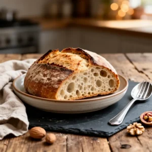 Serve warm with butter, olive oil, or alongside soups and salads. Store leftover bread in a bread box or wrapped tightly in plastic wrap at room temperature for up to 3 days. For longer storage, freeze in a freezer bag or wrapped tightly in foil. Reheat in the oven for a crisp crust.