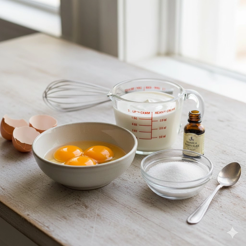 - Tempering and Mixing: Gradually whisk the 3 large egg yolks and the vanilla extract into the warm cream mixture. Continue whisking until the consistency is perfectly smooth and the yolks are fully integrated.