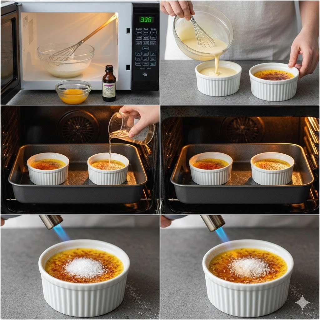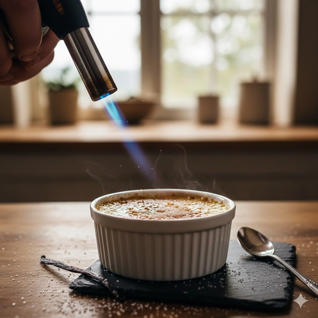 - The Brûlée Finish: Once the custard is chilled and firm, sprinkle 1 tablespoon of white sugar evenly over the surface of each dessert. Using a kitchen torch, move the flame in a circular motion to melt and toast the sugar. The topping should become brown and bubbly, which takes about 30 seconds.