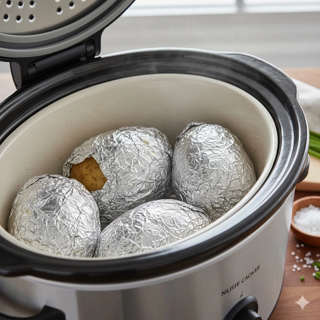 While it is possible to cook potatoes directly in the slow cooker, the foil is highly recommended for this specific recipe. The foil prevents the skins from becoming tough and leathery during the long cooking time. It also helps the salt and oil stay in direct contact with the potato, resulting in a much better-seasoned end product. If you choose to omit the foil, you may find the bottoms of the potatoes become overly browned or “seared” where they touch the heating element.