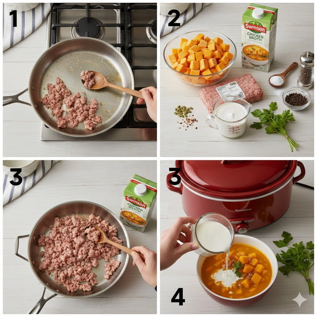 - Combine in the Slow Cooker: Transfer the browned sausage into the basin of your slow cooker. Add the frozen cubed butternut squash, the entire carton of chicken broth, the salt, and the black pepper.