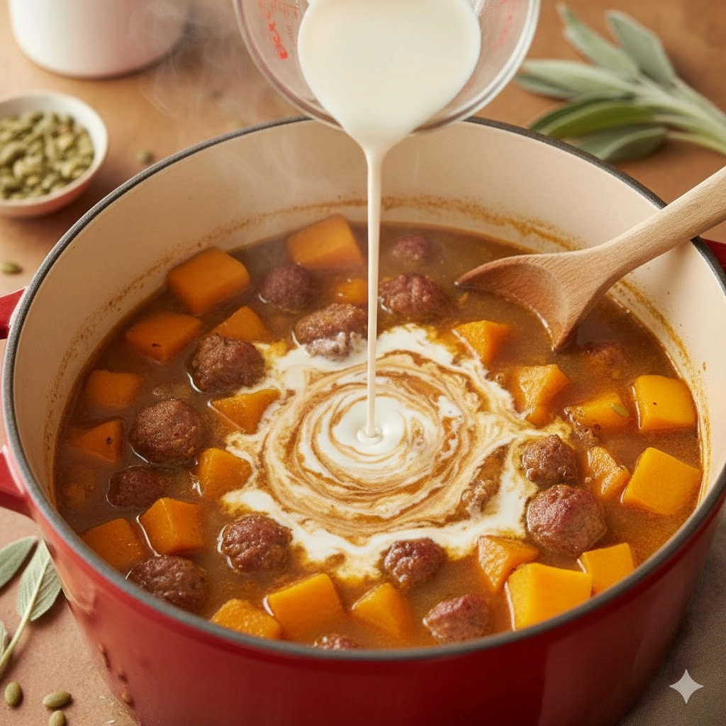 The final step—adding the heavy cream—is a moment of transformation. The cream acts as a bridge between the salty sausage and the sweet squash. However, the temperature of the soup is quite high at this point. To prevent the cream from curdling or the squash from disintegrating, the stirring must be minimal. Think of it as a gentle fold rather than a vigorous whisk. This preserves the structural integrity of the squash cubes, providing a pleasant “bite” amidst the creamy liquid.
