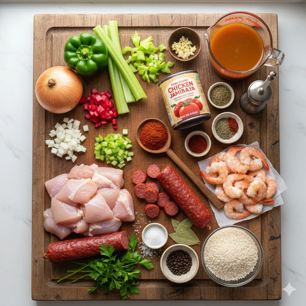 Gathering and preparing your ingredients properly is the first step toward a perfect Creole classic. Note that the rice is listed here but must be cooked separately, as outlined in the instructions.