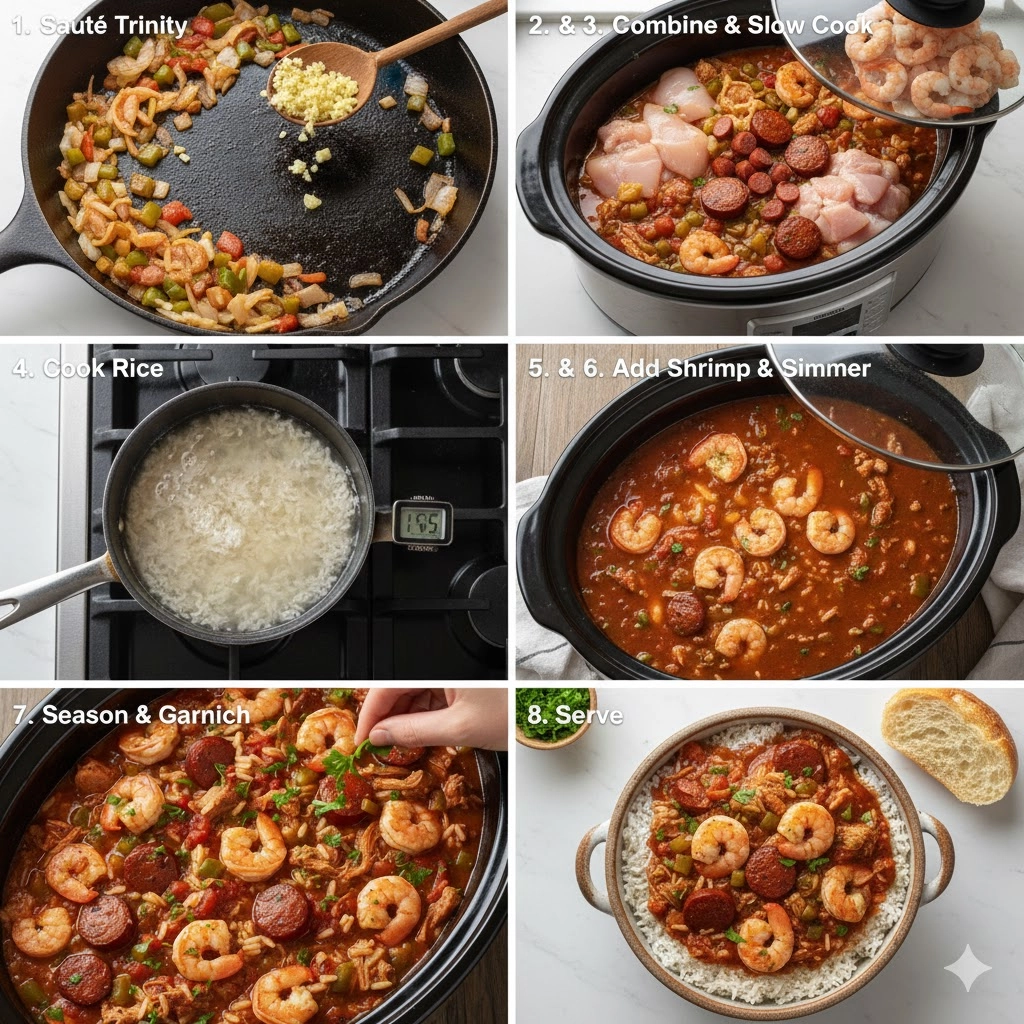 These instructions are broken into two critical stages to ensure all ingredients reach their peak texture. Do not add the shrimp or rice until the initial cook stage is complete.