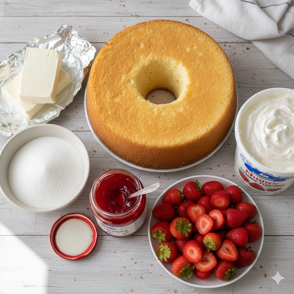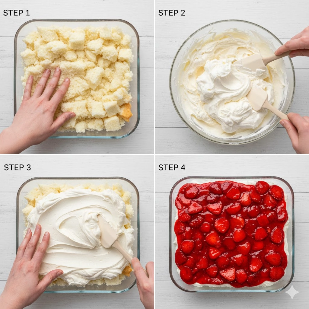 The choice of angel food cake is deliberate. Unlike pound cake, which is dense and buttery, angel food cake is fat-free and leavened entirely by egg whites. This lightness is necessary to balance the richness of the cream cheese and the sugary intensity of the strawberry glaze.