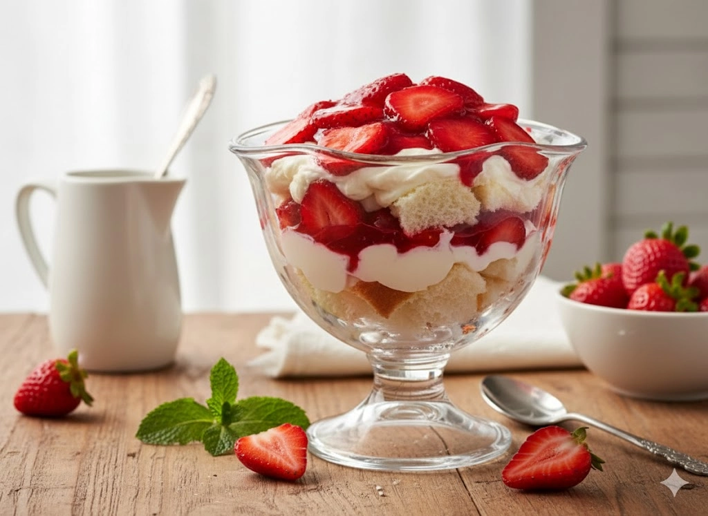 For more formal occasions, consider individual glass parfaits. Use a small round biscuit cutter to cut circles out of the angel food cake that fit perfectly into the bottom of wine glasses or mason jars. Layering individually not only looks elegant but also makes serving a breeze during a busy party. The contrast between the bright red glaze and the stark white cream is naturally photogenic, especially when finished with a small sprig of fresh mint.