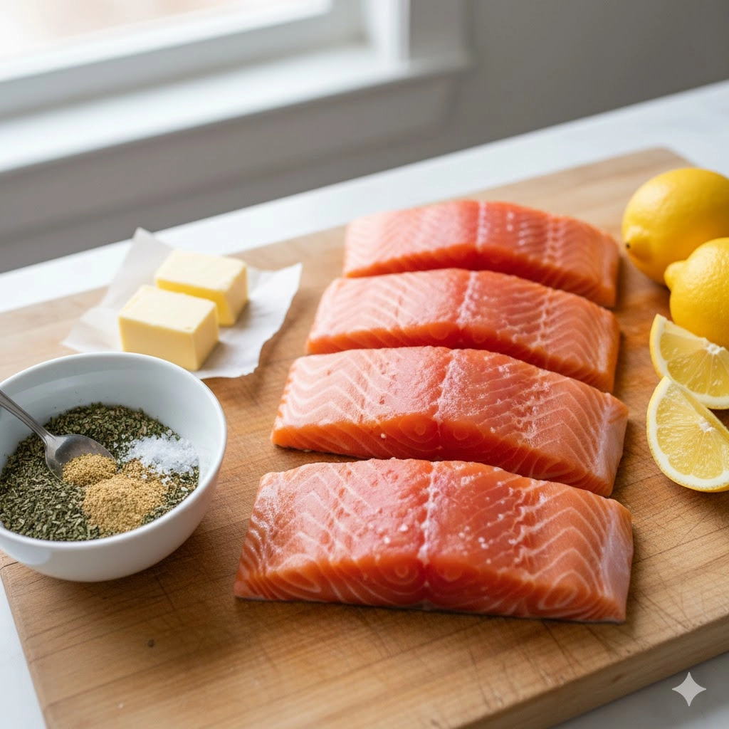 1. Gather all ingredients and pat the salmon fillets dry with paper towels.