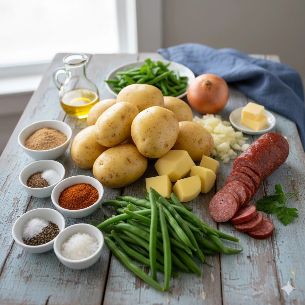 A robust, rustic slow cooker meal featuring gold potatoes, smoky sausage, and fresh green beans in a savory onion butter sauce.