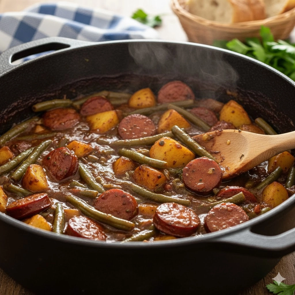 Swamp Potatoes and Sausage is a robust, rustic dish that brings together the earthy flavors of gold potatoes, snappy green beans, and smoky protein in a single pot. This meal is a hallmark of Southern-style slow cooking, where the long, gentle heat allows the fat from the smoked sausage and the rich butter to emulsify with the onion soup mix, creating a savory glaze that coats every ingredient. It is a hearty choice for a family dinner or a weekend gathering where you want a filling, flavorful meal that requires minimal active kitchen time. The combination of Cajun spices and savory onion notes makes this a satisfying standout.