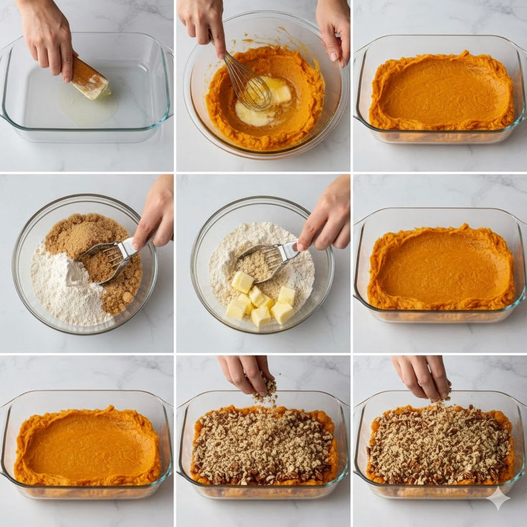 - Fold in the chopped pecans and distribute this crumble evenly over the potato layer.