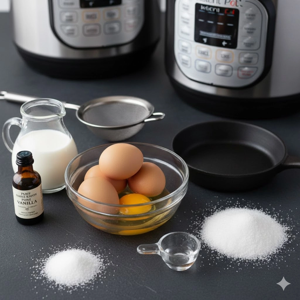 To achieve the ideal balance of sweetness and structural integrity, high-quality dairy and fresh eggs are essential. This recipe is designed for a standard pressure cooker-safe cake pan or large ramekins.
