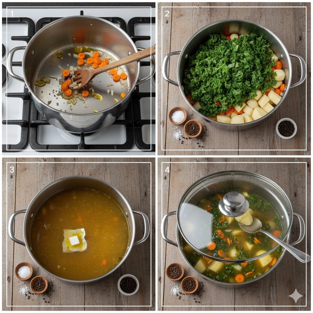 Follow these straightforward steps to bring your Vegetarian Kale Soup to life. The beauty of this recipe lies in its efficiency, taking you from prep to table in thirty minutes or less.