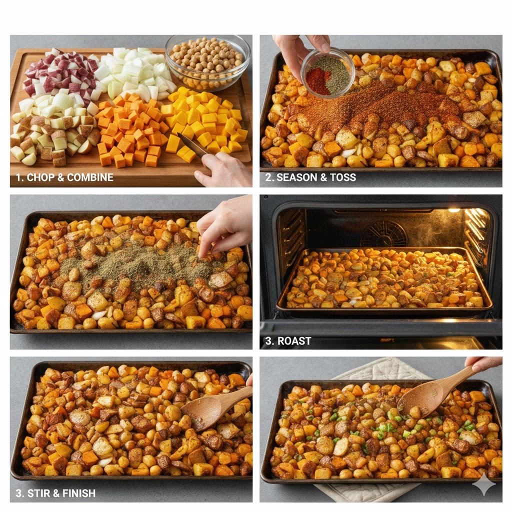 A hearty and nutritious vegetarian sheet pan dinner featuring roasted russet potatoes, sweet potatoes, butternut squash, and protein-rich chickpeas seasoned with sage and fennel.
