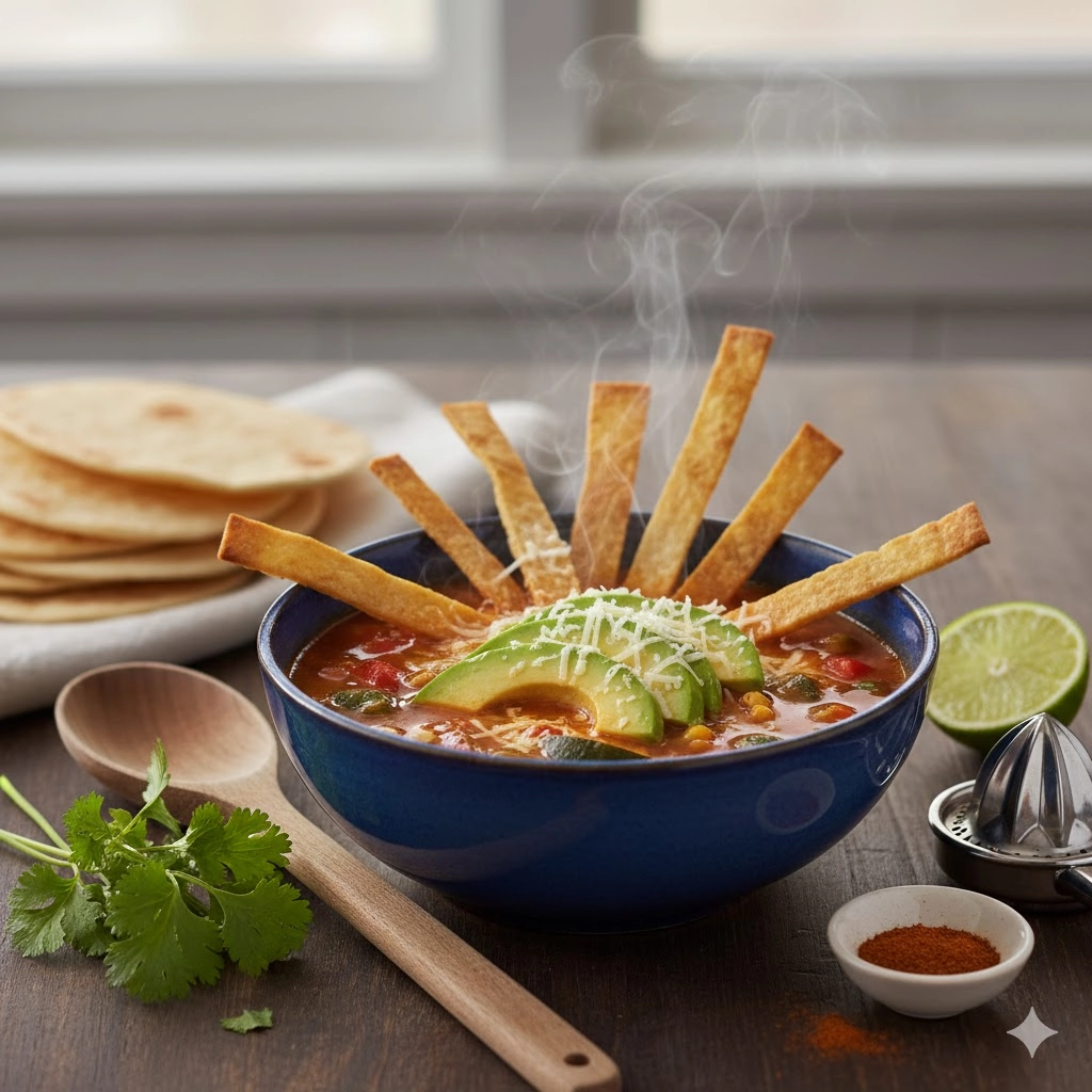 - To serve, ladle the hot soup into deep bowls. Garnish each portion generously with the crispy tortilla strips, fresh avocado slices, and a sprinkle of Monterey Jack cheese.