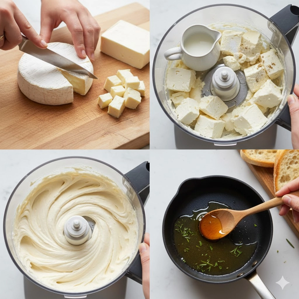 - Prepare the Brie: Remove the rind from the Brie wheel and cut the softened cheese and cream cheese into cubes.